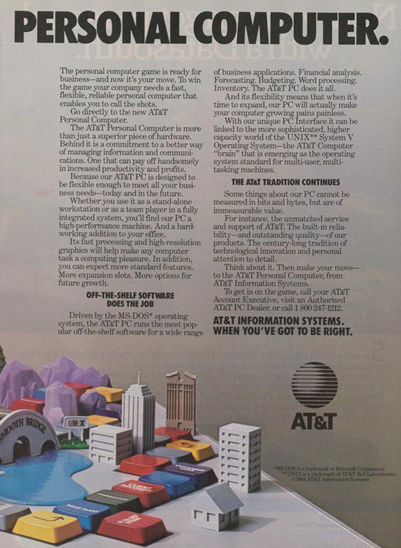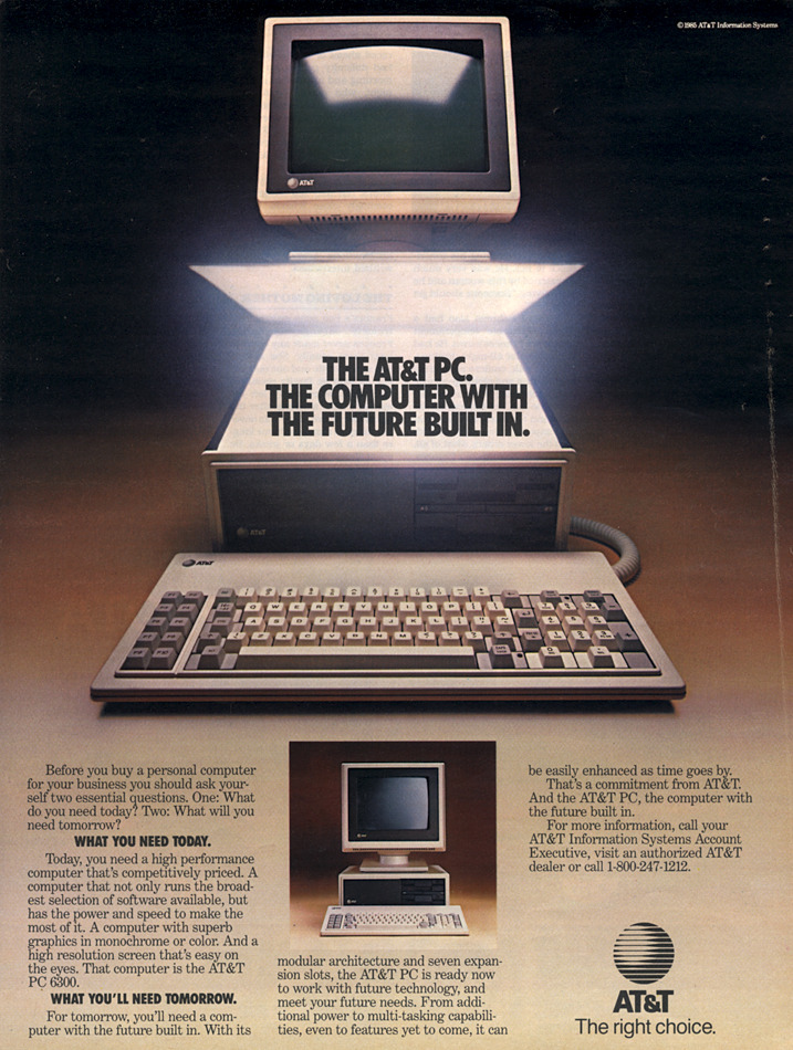 ![]() The PC 6300 was in fact an Olivetti M24 sold under the ATT brand. Launched a few months after the presentation of six new UNIX super-micro and mini ATT computers (march 1984), the PC 6300 was the first ATT system to be IBM PC compatible. It represented the low-end system of the ATT products. But the PC-6300 (and the Olivetti M24) was an excellent PC compatible system, twice faster than the IBM PC XT computer thanks to a real 16 bit CPU, the Intel 8086, which ran at 8Mhz as opposed to the 8088 of the IBM PC running at 4,7Mhz. The standard graphic possibilities were also better than those of the IBM PC. ![]() Il PC6300 era in realtà un Olivetti M24 venduto come AT&T. Lanciato pochi mesi dopo la presentazione di sei nuovi UNIX super-micro e mini computer AT&T (marzo 1984), il PC6300 è stato il primo sistema AT&T compatibile PC IBM, rappresentava il sistema low-end dei prodotti AT&T. Il PC6300 (Olivetti M24) è un sistema compatibile PC due volte più veloce dei computer IBM PC XT grazie ad un vero e proprio 16 bit, con la CPU Intel 8086, che girava a 8Mhz rispetto ai 4,7 Mhz dell'8088 dell' IBM PC XT e anche le possibilità grafiche standard erano migliori di quelli del PC IBM. ![]() A PC6300 in the 1987 film "The Secret of My Success" Un PC6300 nel film del 1987 "Il segreto del mio successo" A PC6300 retrospective with Olivetti M24 quotations. Una retrospettiva sul PC6300 con ampie citazioni sull'Olivetti M24. by Jim Leonard (trixter@oldskool.org)